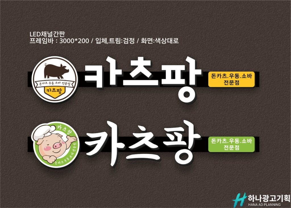 돈까스나 우동 같은 메뉴는 남녀노소 누구나 좋아하기 때문에 간판에서부터 ‘친근함’과 ‘맛’이 느껴져야 합니다. 오늘은 실제 제작 중인 시안을 통해 어떻게 디자인해야 손님이 들어오는지 보여드릴게요. 카츠팡 간판 시안 이미지입니다. 요즘들어 식당 창업하시는 분들이 많이 찾는 간판이 LED 채널간판입니다. 위에 보이는 ‘카츠팡’ 간판은 돈카츠·우동·소바 전문점의 느낌을 살리면서도, 가시성이 높은 ‘검정 프레임’과 ‘LED 입체채널 타입’으로 구성했습니다. _____________________________________________________________시안• LED